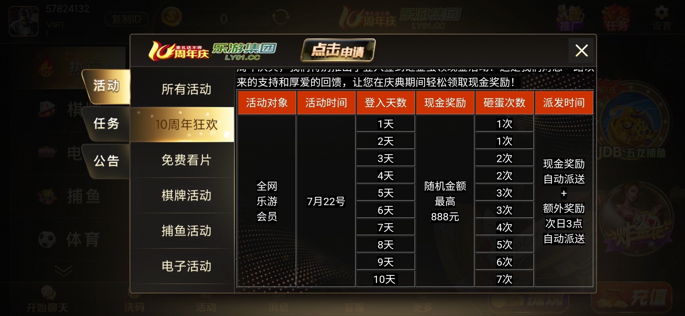 乐游棋牌十周年庆,有账号的登录老账号,22号开启砸金蛋,没账号的新注册,每日登录免费一次砸金蛋