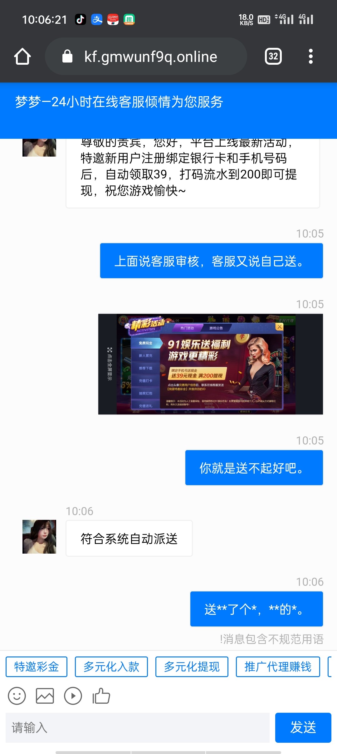 我问你是不是活不起了?特邀你都发出来。还有平台里面说人工审核。   客服又说系统送还有这他妈是特邀。他妈的,你要是没名单,人家做特邀干嘛?你个傻缺。