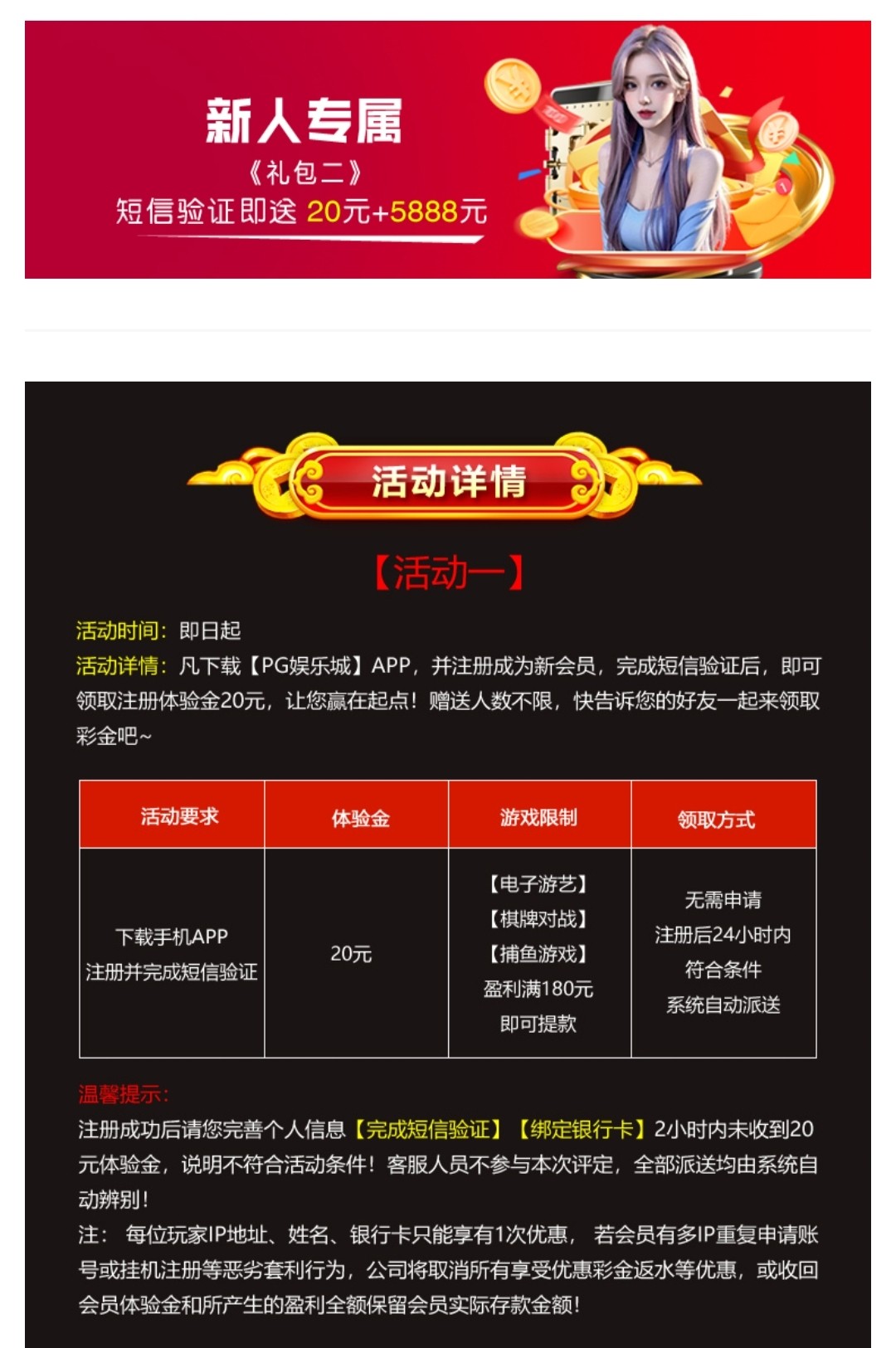 新用户下载APP完成手机验证绑卡然后24小时内自动送20彩金180提,具体自测
