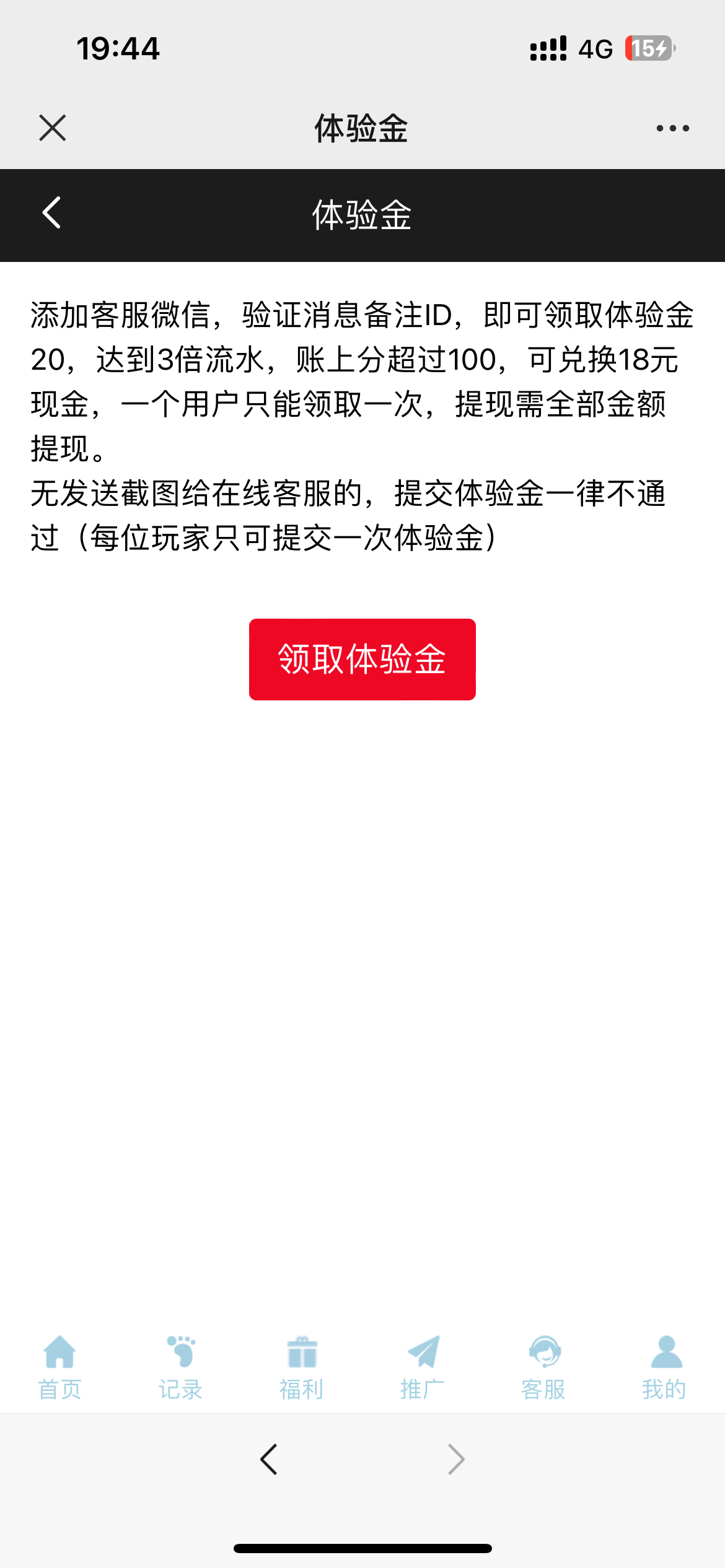 点福利 然后点领取体验金 送20打100下18