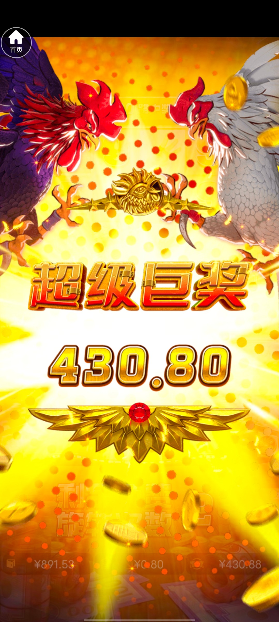 本来玩别的电子一直杀 输到30就想着来双喜试试,结果转了四五次来了免费给了500倍,然后去金鸡拉了十下进免费又来了五百倍,本来想着提个450送几十块钱,结果金鸡又炸了