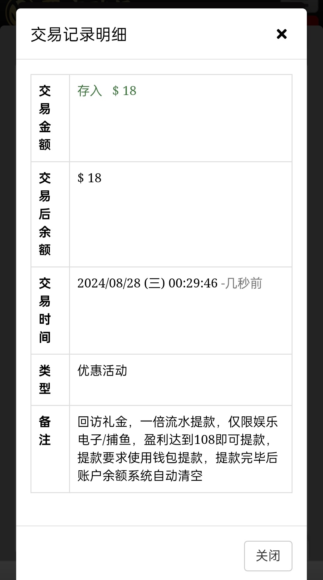 之前注册过的登入上去看看有没有,登入上去会弹出来一个一键领取的,一倍流水只能玩电子/捕鱼108提款!具体自行查看!