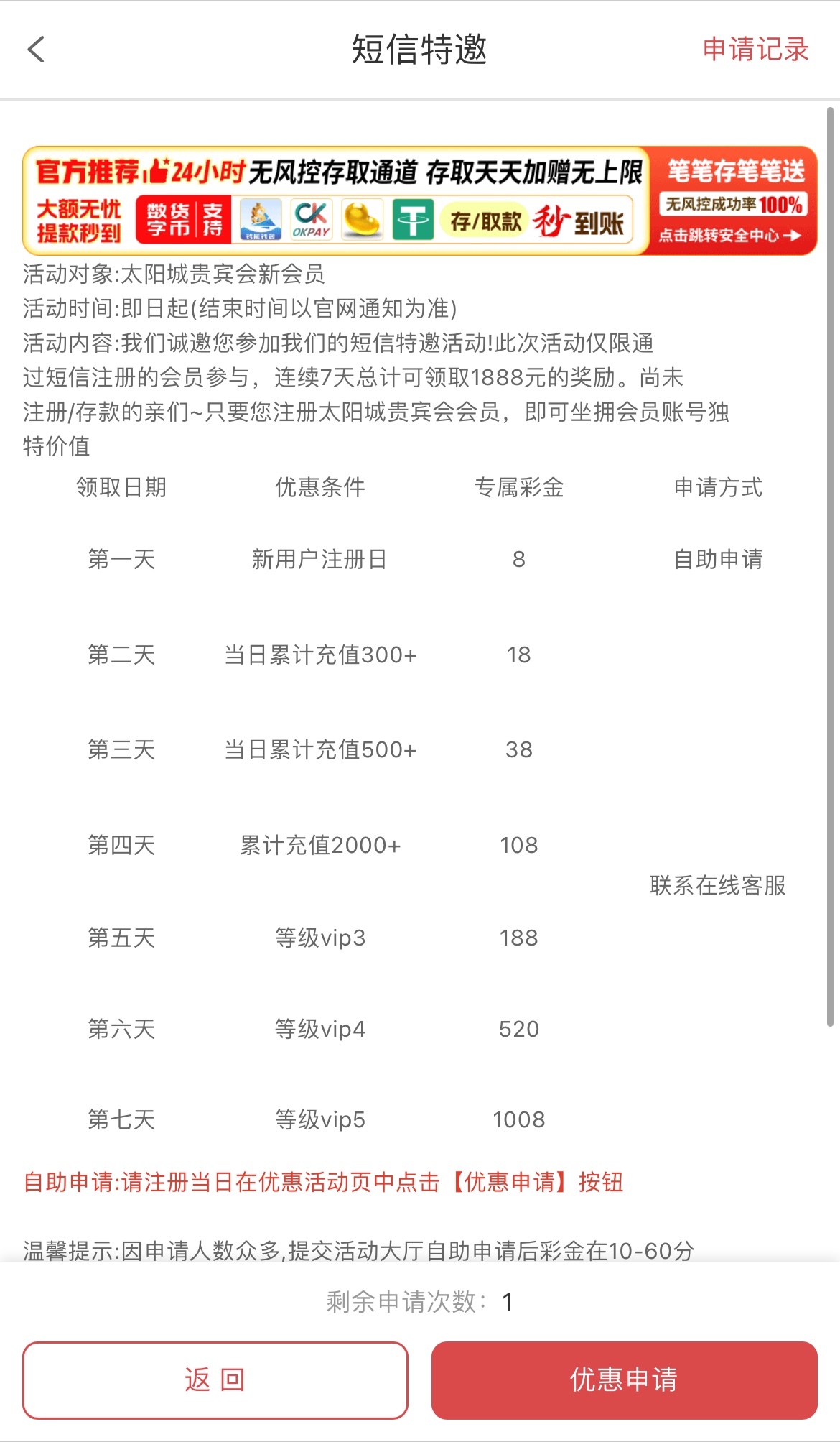 碰瓷短信特邀,注册完善资料,优惠里申请,好像没有游戏限制优惠里没说兄弟们去试试吧