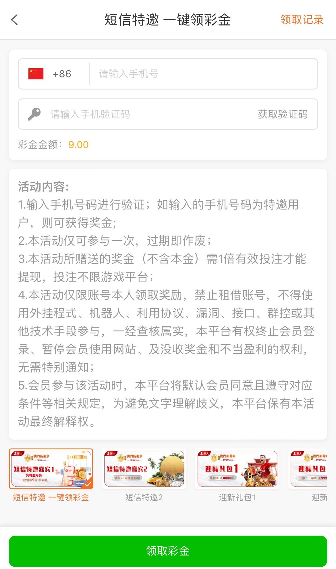 碰瓷短信特邀,自助送9,彩金一倍流水,没有游戏限制