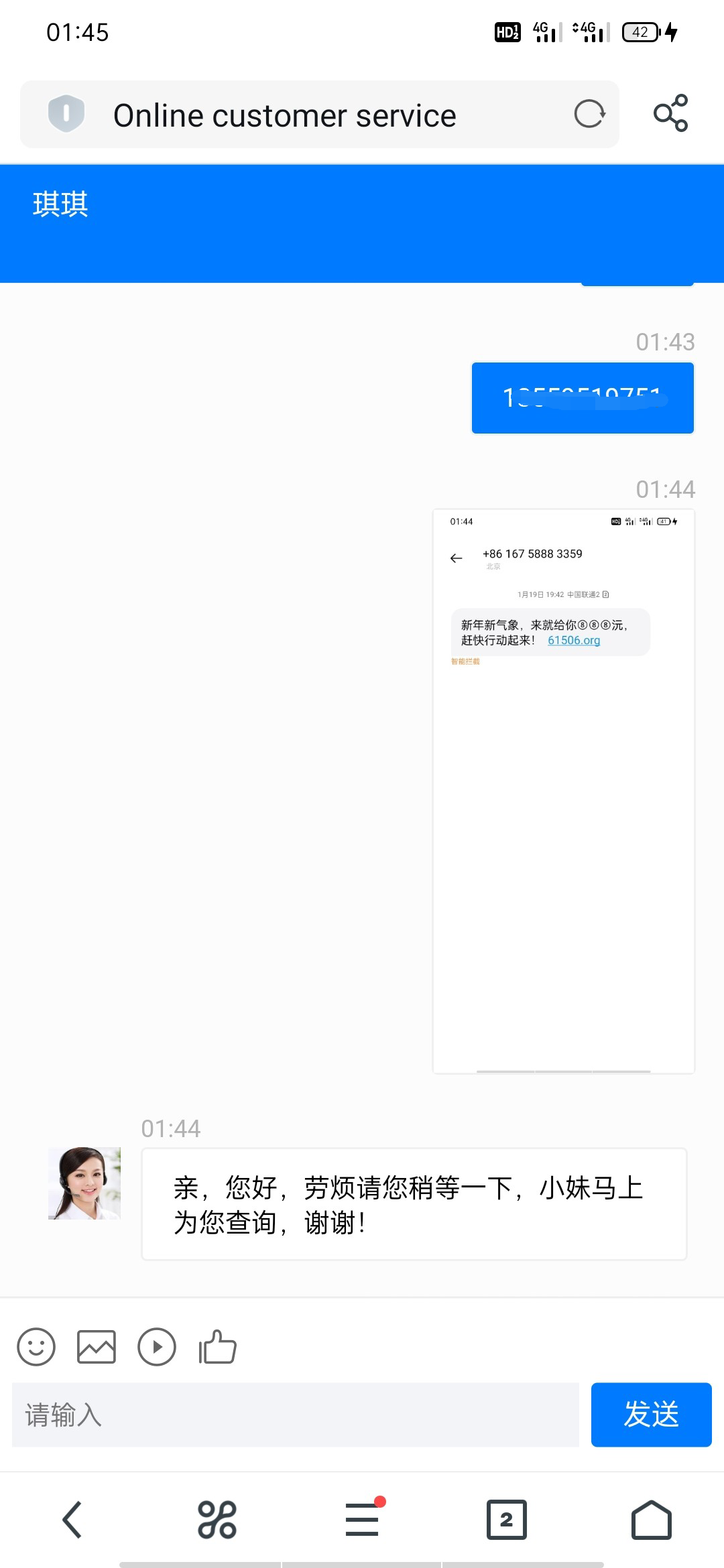 收到短信的去 这个短信基本被拦截 去拦截箱里看看 注册绑定手机号秒2 找客服发手机号领36 查手机号