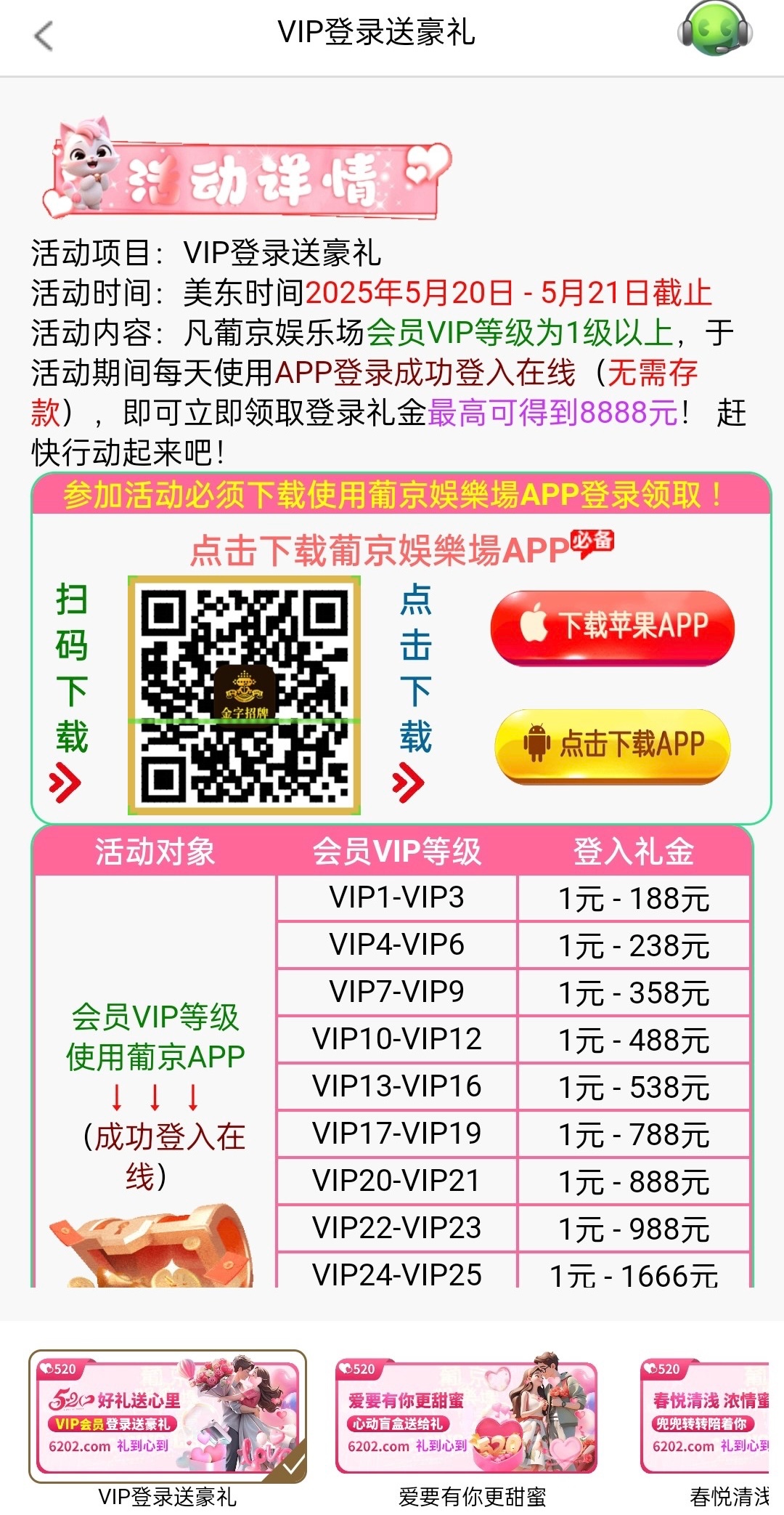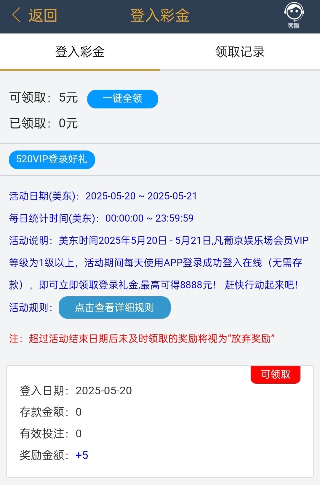 520登入彩金要求是VIP1以上的用户,符合的兄弟可以上号领一下彩金