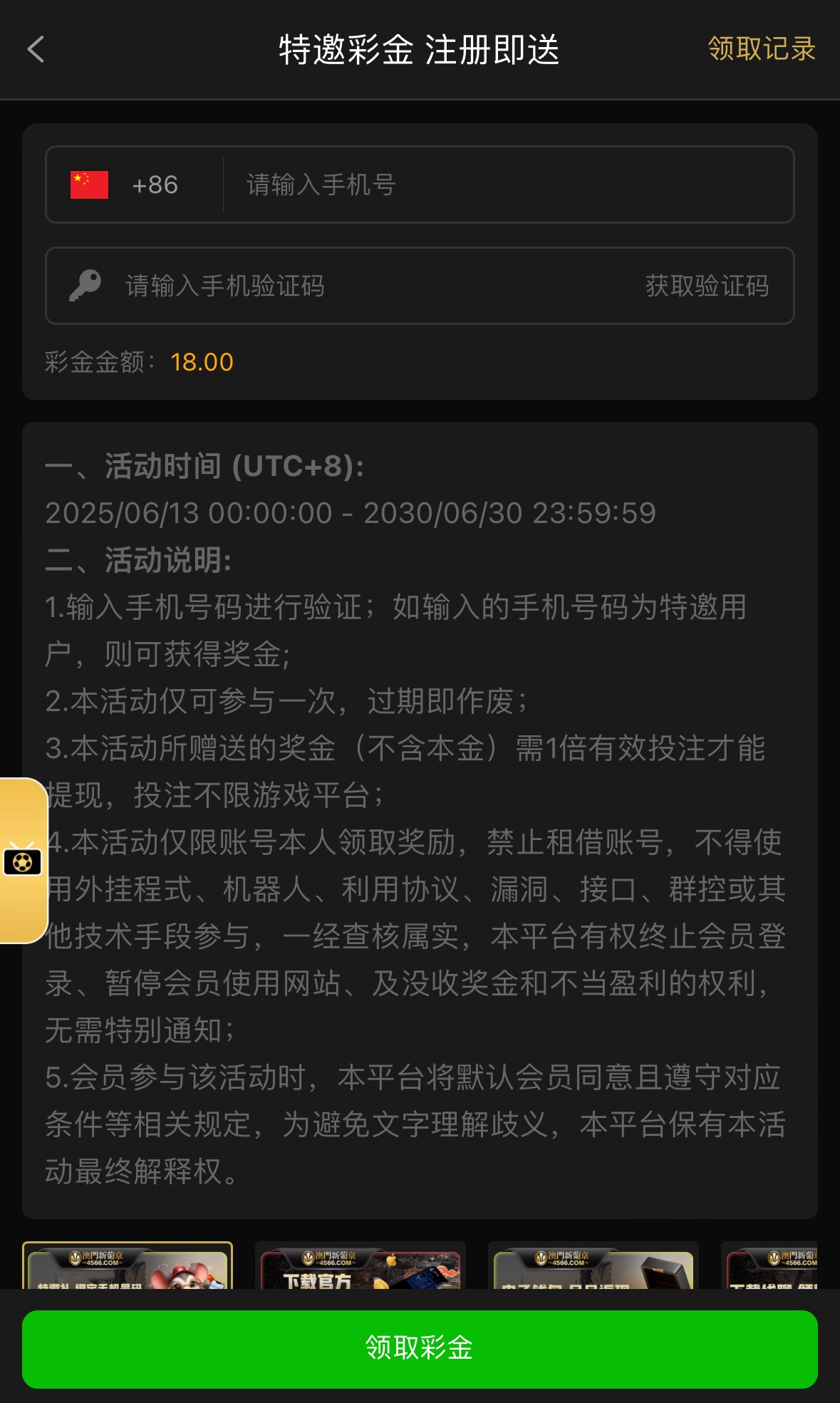 特邀碰瓷,注册完善信息优惠里自助申请,不限制游戏,一倍流水