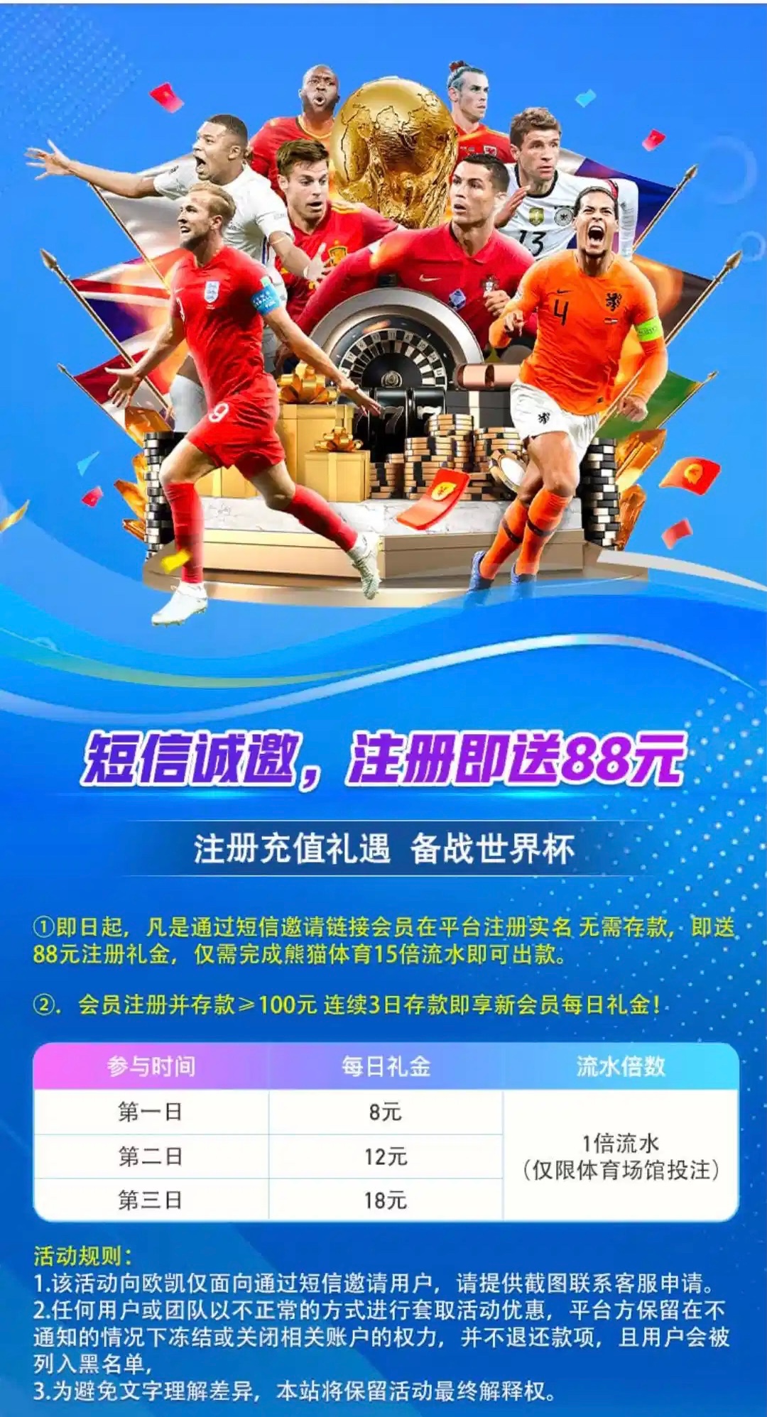 短信特邀送88彩金,注册好联系客服说领取特邀彩金,只能打熊猫体育,15倍流水