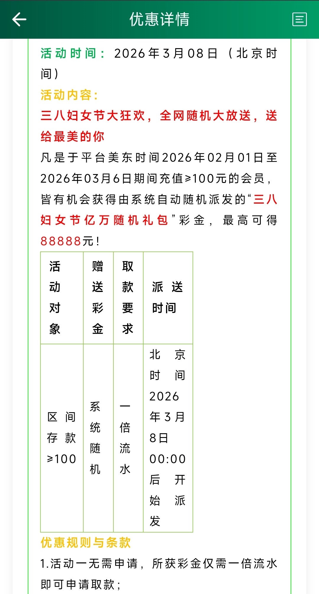 在2月1日至3月6日期间充值过100登入上系统自动派发,一倍流水取款,仅限女性用户